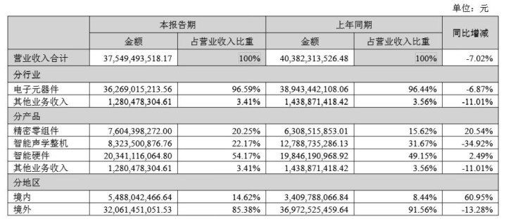 投资时间网、标点财经研究员注意到,今年上半年,歌尔股份智能声学整机业务的收入较上年同期减少34.92%。该公司表示,这是由于该板块中个别项目受产品迭代周期的影响而收入有所下降,进而导致公司上半年整体营收略低于去年同期。